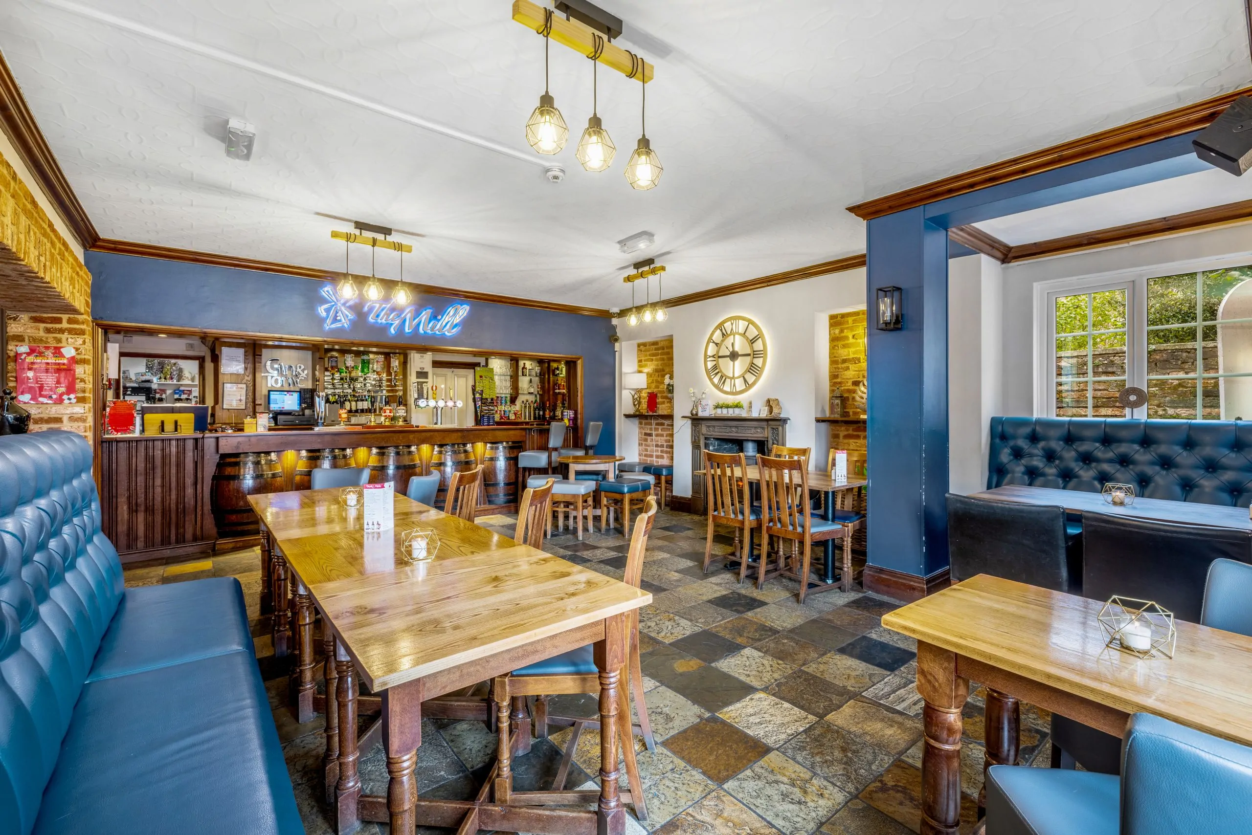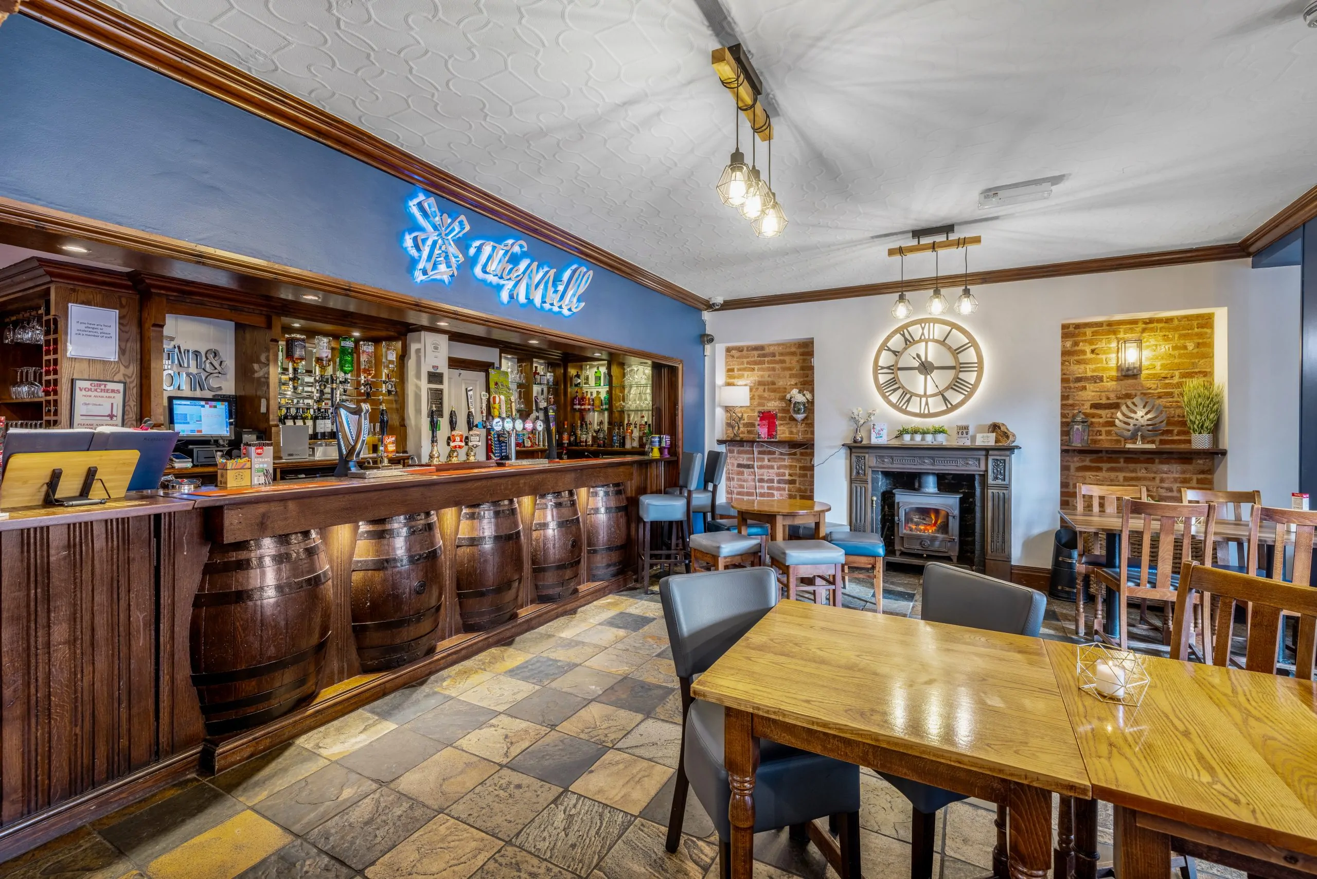 The Mill is always warm and inviting with a roaring fire in the cold winter months and great areas to sit outside, both at the front and back of the pub, in the summer.